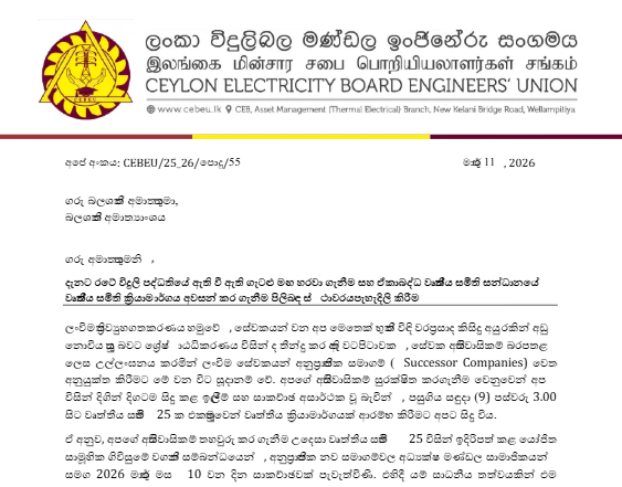 ලංකා විදුලිබල මණ්ඩල ඉංජිනේරු සංගමයෙන් බලශක්ති ඇමතිට ලිපියක්..