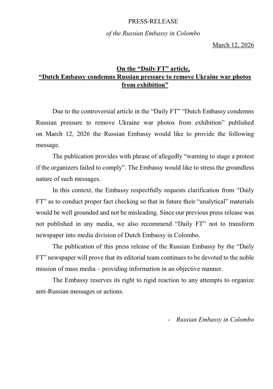 2026 මාර්තු 12 වන දින ප්රකාශයට පත් කරන ලද Daily FT පුවත්පතේ “යුක්රේන යුද ඡායාරූප ප්රදර්ශනයෙන් ඉවත් කිරීම සම්බන්ධයෙන් ලන්දේසි තානාපති කාර්යාලය රුසියානු පීඩනය හෙළා දකී” යන මතභේදාත්මක ලිපිය හේතුවෙන් රුසියානු තානාපති කාර්යාලය පහත පණිවිඩය ලබා දීමට කැමැත්තෙමු.