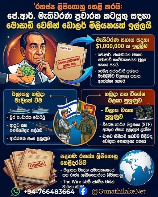 විශේෂ හෙළිදරව්වක් වන්නේ ජනාධිපති ජූනියස් රිචඩ් ජයවර්ධන මහතා ද ඊශ්රායල නියෝජිතයන්ගෙන් මූල්ය ආධාර ඉල්ලා තිබූ බවයි. එම වාර්තාවේ උපුටා දක්වා ඇති රාජ්ය තාන්ත්රික පණිවිඩයකට (diplomatic cable) අනුව, එක්සත් ජාතික පක්ෂයේ මැතිවරණ ව්යාපාරයට සහාය වීම සඳහා ජයවර්ධන මහතා ඩොලර් මිලියන 1 ක් ඉල්ලා ඇති අතර, ඔහු තවදුරටත් බලයේ සිටියහොත් ඊශ්රායලයේ අඛණ්ඩ සහාය ශ්රී ලංකාවට හිමිවනු ඇති බවට ඉඟි කර ඇත.